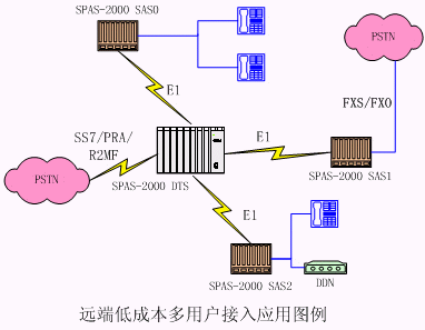 tyutSPAS-2000可編程交換機通過E1可以支持多個遠端模塊。遠端模塊采用SPAS-2000 SAS框,可以帶多種用戶接口:普通模擬用戶、DDN、環(huán)路中繼用戶;通過SPAS-2000 DTS對外提供各種信令接入。適合多點接入組網(wǎng),組網(wǎng)成本低廉。 在示意圖中,SAS表示遠端用戶接入框,它可以通過需要選擇接入模擬用戶:FXO/FXS、E/M、普通模擬用戶和DDN。中心為SPAS可編程交換機,可以通過 SS7/PRA/R2MF進行匯接轉(zhuǎn)換。