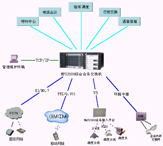 同時MPS2000綜合業(yè)務(wù)交換機能支持NO.7、NO.1、Q.931等在網(wǎng)運行的所有信令協(xié)議。