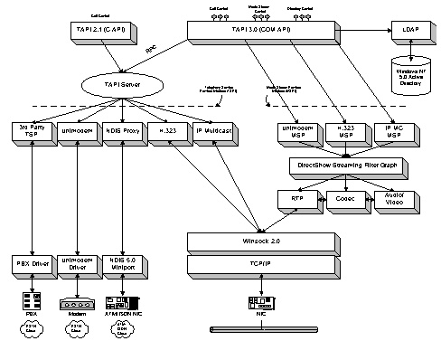 最新的TAPI 3.0基于微軟的COM標(biāo)準(zhǔn),它允許TAPI應(yīng)用程序采用包括JAVA?、Visual Basic?、Visual C++?在內(nèi)的各種語(yǔ)言進(jìn)行編寫(xiě),同時(shí)還可以方便的通過(guò)ActiveX技術(shù)將其移植到互聯(lián)網(wǎng)中去。TAPI除了支持傳統(tǒng)的電話應(yīng)用,還支持標(biāo)準(zhǔn)的H.323會(huì)議和IP多點(diǎn)會(huì)議,良好的QoS支持使得它增強(qiáng)了會(huì)議的質(zhì)量和網(wǎng)絡(luò)的可管理性。TAPI采用了統(tǒng)一的媒體流接口-DirectShowTM,TAPI媒體流提供商(MSP)只要針對(duì)不同的電話提供商(TSP)來(lái)實(shí)現(xiàn)DirectShowTM接口就可以被應(yīng)用程序使用。
