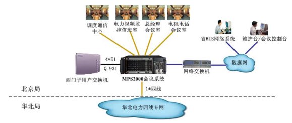 該會(huì)議系統(tǒng)是市公司與地市電力公司“一主兩備”系統(tǒng)的電話會(huì)議系統(tǒng)備份系統(tǒng),通過(guò)4個(gè)數(shù)字中繼與通信公司西門(mén)子用戶(hù)交換機(jī)互連,采用Q931信令。8路4線中4路分別接調(diào)度通信中心調(diào)音臺(tái)、電力視頻監(jiān)控值班室、總經(jīng)理會(huì)議室、電視電話會(huì)議室,實(shí)現(xiàn)會(huì)議室擴(kuò)音設(shè)備的接入,其余1路接原四線與華北電力公司四線專(zhuān)網(wǎng)資源連接,從而實(shí)現(xiàn)了華北局與北京局電話會(huì)議系統(tǒng)電話會(huì)議系統(tǒng)實(shí)時(shí)熱備份。