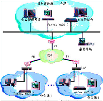 揚州市電子政務是江蘇省第一家電子政務試點單位, 該項目建成后,在電子政務專網上實現(xiàn)市、區(qū)縣兩級較高圖像和聲音質量的交互式視頻會議。揚州市政府視頻會議系統(tǒng)拓撲圖