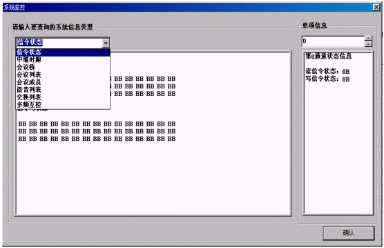 通道監(jiān)控:在監(jiān)控欄中顯示0~89個(gè)通道,每個(gè)通道對(duì)應(yīng)一個(gè)用戶,當(dāng)用戶撥接入號(hào)入會(huì)時(shí),用戶自動(dòng)占用一個(gè)通道,用光標(biāo)移至該通道時(shí)它自動(dòng)地打開(kāi)提示欄,里面顯示該用戶的主叫號(hào)碼、級(jí)別。