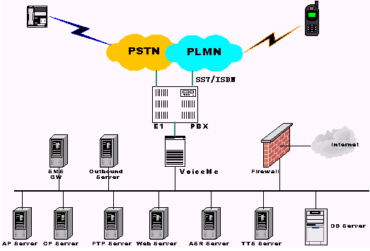 整個系統(tǒng)平臺前端接入可直接從電信或移動交換機提供的信號接入,如中國一號、SS7以及ISDN等,通過PBX連入平臺核心VoiceMe服務(wù)器,系統(tǒng)接入容量可擴至幾十個乃至上百個E1接入。系統(tǒng)主要包括語音控制、多媒體應(yīng)用和內(nèi)容管理等部分,其中主要包括: