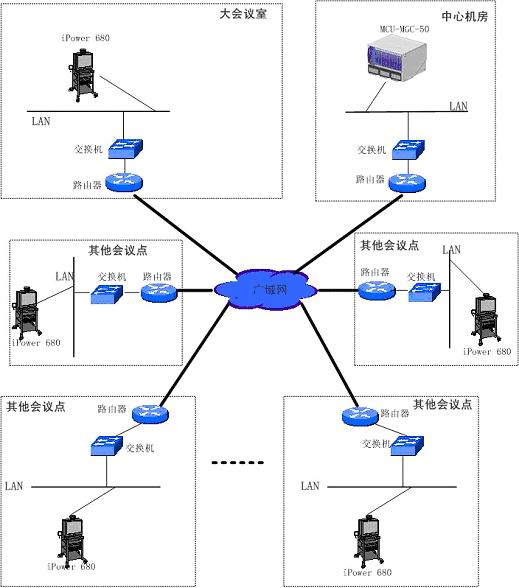 用戶將組建以多點(diǎn)控制單元MCU為中心,采用H.323 IP連接方式的H.323標(biāo)準(zhǔn)會(huì)議電視網(wǎng),端口速率為768kbps,多點(diǎn)控制單元要求的容量是可達(dá)到48個(gè)節(jié)點(diǎn)的同時(shí)接入。