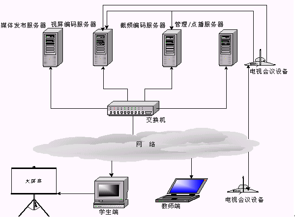 當(dāng)老師端在異地時(shí)(攝像頭離服務(wù)器較遠(yuǎn),無(wú)法物理連接),可通過"電視會(huì)議系統(tǒng)"將老師的圖像及聲音實(shí)時(shí)傳送到編碼服務(wù)器,桌面課件可以通過PcAnywhere傳送到編碼服務(wù)器。圖像,聲音和桌面課件通過Web Streaming采集壓縮并在網(wǎng)上實(shí)時(shí)廣播。這種系統(tǒng)架構(gòu)也是當(dāng)今功能比較齊全和完善的一種實(shí)現(xiàn)方式。