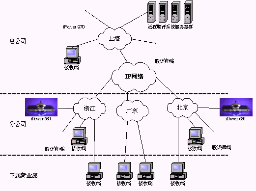 某證券公司有三級(jí)網(wǎng)絡(luò),總公司、分公司和下屬營(yíng)業(yè)部?偣镜椒止編捠2M,在總公司配置一套會(huì)議室型電視會(huì)議終端POLYCOM 970和一套多點(diǎn)會(huì)議服務(wù)器Radvision ViaIP400。在分公司配置了38套會(huì)議室型電視會(huì)議終端POLYCOM 680,用于與總公司進(jìn)行雙向視頻會(huì)議。分公司到營(yíng)業(yè)部帶寬是512K,各營(yíng)業(yè)部安裝遠(yuǎn)程股評(píng)系統(tǒng)接收端程序,遠(yuǎn)程股評(píng)系統(tǒng)服務(wù)器都放置在海通總公司。當(dāng)在總公司進(jìn)行股評(píng)時(shí),總公司本地?cái)z像頭拍攝教師畫面,MIC采集教師聲音,傳給服務(wù)器編碼,再通過網(wǎng)絡(luò)供各個(gè)接收端接收;當(dāng)在分公司進(jìn)行股評(píng)時(shí),首先分公司的電視會(huì)議設(shè)備采集教師畫面及聲音傳回總公司的電視會(huì)議設(shè)備,再傳給遠(yuǎn)程股評(píng)系統(tǒng)的服務(wù)器進(jìn)行編碼,然后通過網(wǎng)絡(luò)發(fā)布,供接收端接收。(結(jié)構(gòu)如下圖)