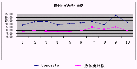 下圖可以看出使用原預覽外撥和采用Concerto預測外撥系統(tǒng)后單位座席每小時有效呼叫數(shù)量的比較: