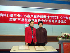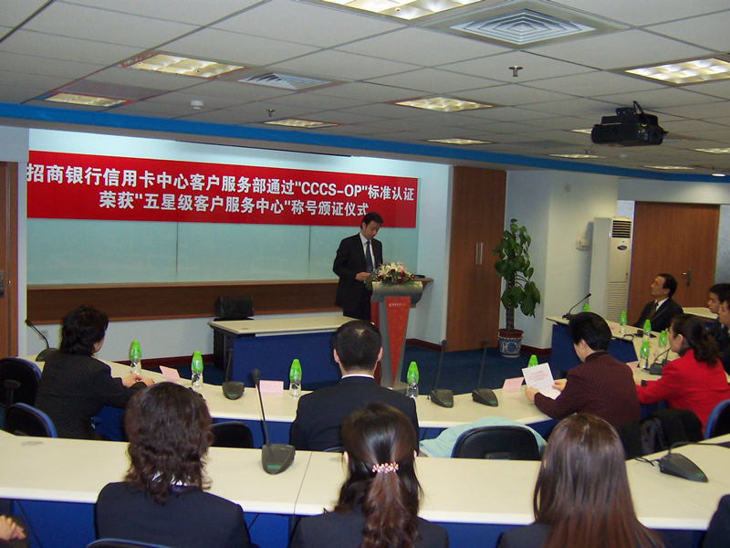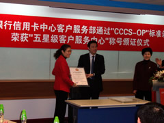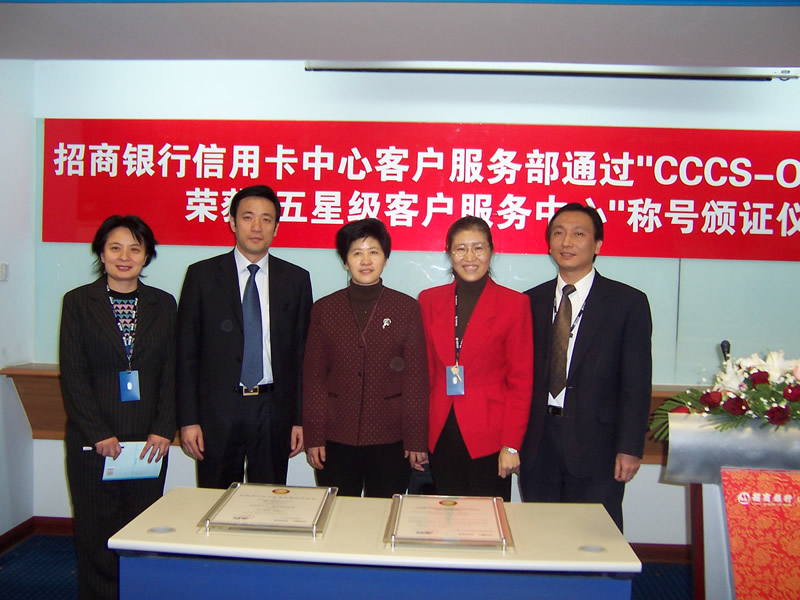 這天的上午10點(diǎn)30分,在招商銀行信用卡中心上?偛颗e行了簡(jiǎn)約而隆重的頒證儀式,信用卡中心常務(wù)副總經(jīng)理梁瑤蘭從信息產(chǎn)業(yè)部電子信息中心副主任、中國(guó)信息化推進(jìn)聯(lián)盟秘書長(zhǎng)劉獻(xiàn)軍手中接過(guò)證書,標(biāo)志著國(guó)內(nèi)第一家五星級(jí)客戶服務(wù)中心誕生了!