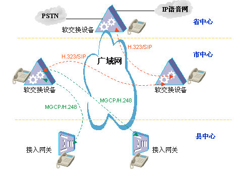 針對這種體系結(jié)構(gòu),軟交換技術(shù)就大有可為了,各地市布置軟交換設(shè)備,其間采用H.323/SIP點(diǎn)對點(diǎn)局間協(xié)議,負(fù)責(zé)各軟交換機(jī)之間的通信,在地市到縣區(qū)之間采用MGCP/H.248協(xié)議,這種協(xié)議體系充分吸取了軟交換體系控制與業(yè)務(wù)分離的思想,具有高度靈活性,可以兼容PSTN、運(yùn)營商IP語音網(wǎng)、原有PBX系統(tǒng)等,并且從多方面保障話音質(zhì)量;管理上由地市軟交換設(shè)備對縣區(qū)的接入網(wǎng)關(guān)設(shè)備進(jìn)行統(tǒng)一管理,號碼進(jìn)行統(tǒng)一分配;同時(shí),由地市軟交換設(shè)備提供多達(dá)數(shù)十種增值業(yè)務(wù),可以實(shí)現(xiàn)業(yè)務(wù)的統(tǒng)一升級,簡單方便。