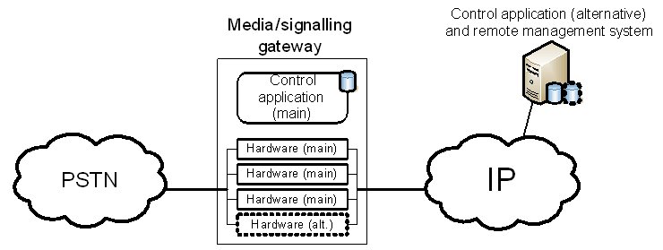 這兩種保護機制的區(qū)別可以從下面的例子進一步闡述。該事例是一種企業(yè)IP-PSTN網(wǎng)關(guān)應(yīng)用。一般情況下,企業(yè)級的網(wǎng)關(guān)并不采用軟交換架構(gòu),所以媒體和信令網(wǎng)關(guān)功能在同一設(shè)備內(nèi)實現(xiàn)。這類網(wǎng)關(guān)是一個獨立的機架,內(nèi)裝能實現(xiàn)媒體和信令處理的硬件板卡和控制類應(yīng)用程序。此設(shè)備可以本地管理,也可以采用遠程管理,如采用標準Web服務(wù)器。