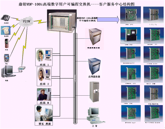 接入平臺實現(xiàn)外界接入的控制和話務(wù)交換、資源的合理分配,是構(gòu)建呼叫中心的成功關(guān)鍵所在。DM大型呼叫中心系統(tǒng)接入平臺采用鼎銘VDP-100i高端數(shù)字可編程交換機(jī),該交換機(jī)所有資源板卡都采用了高集成度、功能模塊設(shè)計思想。該接入平臺的結(jié)構(gòu)如上圖所示的右邊(詳細(xì)的功能模塊資源板請參閱《鼎銘高端數(shù)字可編程交換機(jī)產(chǎn)品手冊》),用戶可以根據(jù)實際情況靈活配置和增減系統(tǒng)的接入方式、資源類型、資源數(shù)量,達(dá)到資源的充分合理利用的目的。