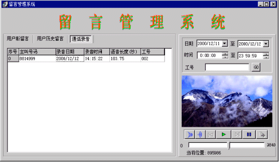 當(dāng)系統(tǒng)中無話務(wù)員登錄或等待超過20秒,則進(jìn)入語音信箱服務(wù)。語音信箱在進(jìn)入時提示用戶:“系統(tǒng)正忙,請留下您的聯(lián)系電話,復(fù)本機(jī)號請掛機(jī),復(fù)其他號碼請輸入電話號碼,按‘#’號鍵結(jié)束,或者在聽到‘嘟’的一聲之后留下你的留言”,當(dāng)主叫號碼位數(shù)不夠7位時,提示:“系統(tǒng)正忙,請輸入您的聯(lián)系電話,按‘#’號鍵結(jié)束,或者在聽到‘嘟’的一聲之后留下你的留言”,系統(tǒng)將客戶留下的電話號碼記錄到數(shù)據(jù)庫中。將留言存放到一個指定目錄中,用話務(wù)號作為語音文件名。