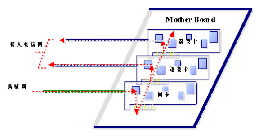 通過局域網(wǎng)傳遞語音數(shù)據(jù)本來就不能保證其時實時性,其結(jié)果就是用戶聽到的語音經(jīng)常斷續(xù),保證不了語音質(zhì)量。如果傳遞的語音數(shù)據(jù)是經(jīng)過壓縮的,語音數(shù)據(jù)本來就是通過TTS進行合成的,再經(jīng)過壓縮,則音質(zhì)會有很大的損傷,因此同樣保證不了語音質(zhì)量。從上圖中我們可以看到,經(jīng)TTS合成的語音數(shù)據(jù)從局域網(wǎng)經(jīng)過網(wǎng)卡,再通過主板PCI(或ISA)總線進入語音卡,最后進入電信網(wǎng),同樣語音數(shù)據(jù)通過計算機主板經(jīng)PCI(或ISA)總線進入語音卡也要求是實時的。這兩種實時性的要求會導致在接入量比較大的情況下,會給計算機的總線造成很大的負擔。因為總線的帶寬(數(shù)據(jù)吞吐量)是有限的。況且其它的板卡和接口(如聲卡、顯示卡等)也要直接或間接地占用總線。因此在接入量比較大的情況下,計算機的總線帶寬會成為一個比較關鍵的瓶頸。即便提高語音板卡的接入能力。在有大量電話接入的情況下,由于語音數(shù)據(jù)實時性的要求,也不能保證語音質(zhì)量。