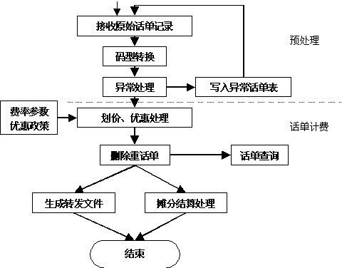 區(qū)域計(jì)費(fèi)中心從交換機(jī)實(shí)時(shí)/定時(shí)采集原始話單數(shù)據(jù),它是整個(gè)系統(tǒng)的起始點(diǎn),也是系統(tǒng)其它部分的基礎(chǔ)。其性能直接影響整個(gè)系統(tǒng)的運(yùn)行效果。對該模塊要求穩(wěn)定可靠、處理靈活。 “八國九制”意味著,一個(gè)好的計(jì)費(fèi)采集系統(tǒng),必然要求它能夠處理多種交換機(jī)格式。比如EWSD、S1240、5ESS等等。 在采集所用網(wǎng)絡(luò)傳輸協(xié)議上,一般要求系統(tǒng)支持X.25/FTAM、X.25/CMIP等協(xié)議。 2.計(jì)費(fèi)結(jié)算 采集機(jī)從交換機(jī)上采集下來原始話單文件,該類文件是BCD碼文件,需要進(jìn)行碼型轉(zhuǎn)換,變成ASCII碼文件,為后續(xù)的計(jì)費(fèi)處理創(chuàng)造條件。 話單格式轉(zhuǎn)換:話單格式轉(zhuǎn)換從交換機(jī)下載的二進(jìn)制信息中提取用于計(jì)費(fèi)和統(tǒng)計(jì)的信息,并從二進(jìn)制格式轉(zhuǎn)換為文本格式。但是由于上面提到的原因,國內(nèi)交換機(jī)種類比較多,各種交換機(jī)的數(shù)據(jù)格式都不相同,即使是相同的交換機(jī),由于需要版本升級,也會對數(shù)據(jù)格式產(chǎn)生影響。假如預(yù)處理模塊不能靈活地處理各種格式的文件,則勢必會對電信服務(wù)商的投資造成浪費(fèi)。國創(chuàng)公司在話單預(yù)處理中,提供了一種“自定義話單格式”方式,用戶可以根據(jù)自己交換機(jī)的數(shù)據(jù)格式進(jìn)行配置,而預(yù)處理模塊不需進(jìn)行修改。即可以適應(yīng)當(dāng)前多種交換機(jī)并存的局面,又可以適應(yīng)未來交換機(jī)版本升級的需求,極大地保護(hù)了用戶的投資。 計(jì)費(fèi)劃價(jià)處理: 計(jì)費(fèi)計(jì)算模塊根據(jù)話單中記錄的起始時(shí)間、通話時(shí)長、對端號碼等信息在資費(fèi)策略庫中查找滿足條件的費(fèi)率極其優(yōu)惠策略。從而計(jì)算出此次通話應(yīng)向用戶收取的基本費(fèi)用。特別地,考慮到業(yè)務(wù)的發(fā)展與變化,系統(tǒng)可對費(fèi)用中的各項(xiàng)子費(fèi)用單獨(dú)計(jì)算,并能夠適應(yīng)新的優(yōu)惠策略的增加。整個(gè)計(jì)費(fèi)流程如下: