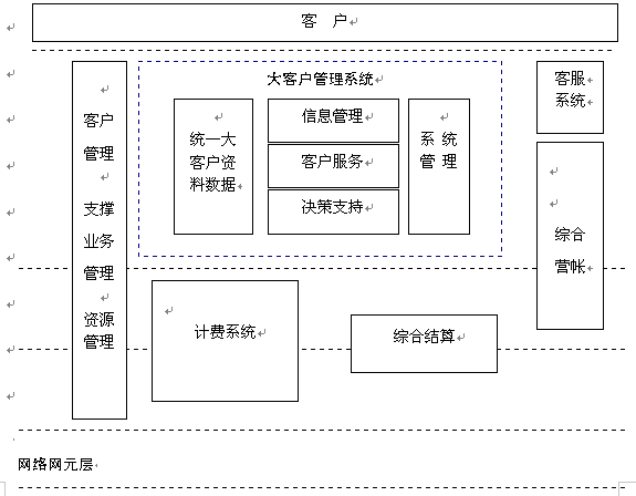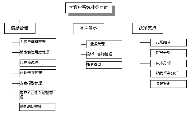 電信大客戶管理系統(tǒng)是在收集大客戶市場(chǎng)調(diào)查信息、大客戶資料信息、大客戶經(jīng)營(yíng)戰(zhàn)略資源的基礎(chǔ)上,自動(dòng)采集專業(yè)計(jì)費(fèi)、綜合營(yíng)帳、客服、網(wǎng)管、財(cái)務(wù)等系統(tǒng)的相關(guān)數(shù)據(jù),實(shí)現(xiàn)快速、全面、準(zhǔn)確的新客戶業(yè)務(wù)受理、新增需求受理及故障處理過程通道,實(shí)現(xiàn)完善的客戶經(jīng)理管理、代理商管理系統(tǒng),最終實(shí)現(xiàn)完整的大客戶滿意度評(píng)估體系和針對(duì)大客戶的個(gè)性化服務(wù)。建成后的系統(tǒng)從管理、服務(wù)、分析三方面出發(fā)主要應(yīng)具備信息管理、客戶服務(wù)、決策支持功能。