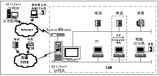 - IP分機——IP分機功能允許將H.323兼容終端設備連接到AltiServ。IP分機具有與模擬分機相同的功能。IP分機可以是IP話機、電腦或電腦加模擬話機。
