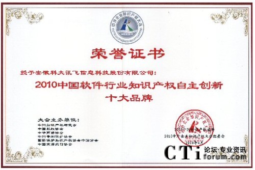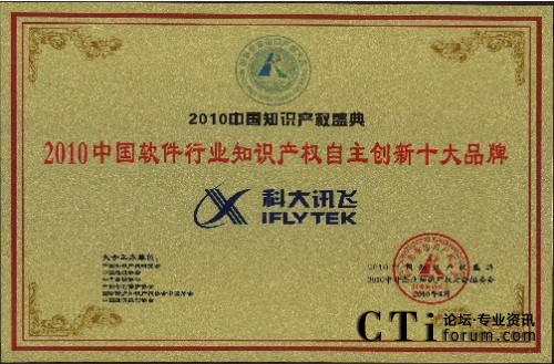 CTI論壇(ctiforum)4月29日消息(記者 潘婷婷):2010年4月25日,由中國知識(shí)產(chǎn)權(quán)研究會(huì)、中國專利保護(hù)協(xié)會(huì)、中國版權(quán)協(xié)會(huì)等單位聯(lián)合舉辦的“2010中外企業(yè)知識(shí)產(chǎn)權(quán)大會(huì)”在人民大會(huì)堂隆重舉行。在當(dāng)日的“2010中國知識(shí)產(chǎn)權(quán)盛典頒獎(jiǎng)典禮”中,科大訊飛憑借強(qiáng)大的自主創(chuàng)新能力以及在知識(shí)產(chǎn)權(quán)創(chuàng)造、保護(hù)與應(yīng)用方面的突出表現(xiàn)獲評(píng)“2010年中國軟件行業(yè)知識(shí)產(chǎn)權(quán)自主創(chuàng)新十大品牌”。CTI論壇報(bào)道