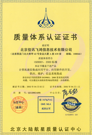 經(jīng)過(guò)近半年時(shí)間的建立和保持質(zhì)量體系運(yùn)行,佳訊飛鴻于在2002年3月順利的通過(guò)為期三天的嚴(yán)格審核,并重點(diǎn)對(duì)佳訊公司核心技術(shù)的CTI平臺(tái)進(jìn)行審核。2002年4月2日通過(guò)了ISO國(guó)際組織的新體系標(biāo)準(zhǔn)ISO9001:2000的體系認(rèn)證,取得了通過(guò)該標(biāo)準(zhǔn)的認(rèn)證證書。佳訊飛鴻公司也成為國(guó)內(nèi)第一家對(duì)CTI平臺(tái)進(jìn)行審核并通過(guò)認(rèn)證的公司。其完成標(biāo)志著公司從成立之時(shí)起即嚴(yán)格遵循國(guó)際企業(yè)標(biāo)準(zhǔn)及現(xiàn)代企業(yè)管理模式,以軟件產(chǎn)品質(zhì)量管理體系為載體,以客戶需求為導(dǎo)向。全面提高產(chǎn)品、服務(wù)質(zhì)量,順應(yīng)不斷變化的技術(shù)發(fā)展方向和市場(chǎng)變化,在質(zhì)量、技術(shù)、成本和交期等方面全力滿足客戶需求,為客戶提供最佳性價(jià)比的產(chǎn)品和服務(wù)。