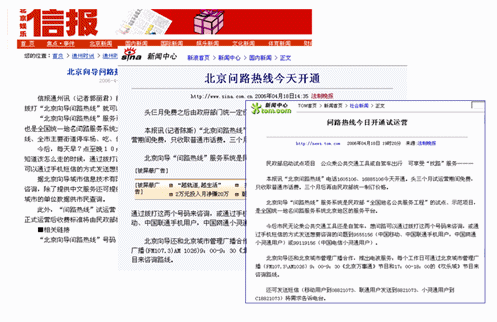 北京向?qū)峋經(jīng)過一個(gè)多月緊張的開通工作,終于于4月18號(hào)正式開通。新浪、網(wǎng)易、TOM等媒體爭相報(bào)道北京向?qū)У拈_通情況。 今后市民問路,可以通過撥打電話1605106、16885106這兩個(gè)號(hào)碼來咨詢,或通過手機(jī)短信的方式發(fā)送想要咨詢的問題到9555156中國移動(dòng)、中國聯(lián)通手機(jī)用戶,中國網(wǎng)通小靈通用戶或99119156中國電信小靈通用戶。
