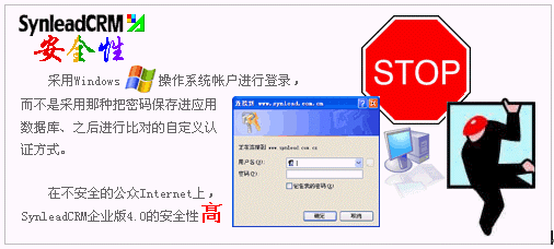 SynleadCRM企業(yè)版4.0采用了高度捆扎操作系統(tǒng)安全性的域帳戶認證,而不是在應(yīng)用層面自定義用戶認證策略。事實上,SynleadCRM從一開始就基于這種安全機制并且不斷完善,以避免今后無法向更高端邁進。
