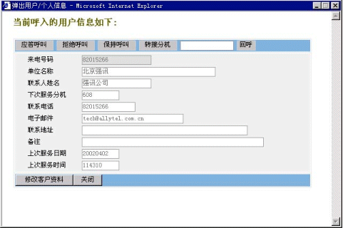 4、來電顯示:當(dāng)有外線電話撥入坐席,坐席電話振鈴的同時,會在顯示器上彈出新窗口顯示來電用戶的信息;