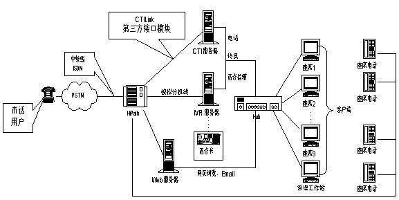 企業(yè)級統(tǒng)一消息平臺,它將交換技術(shù)、CTI技術(shù)、INTERNET技術(shù)合理地應(yīng)用到系統(tǒng)中,包含了基于數(shù)據(jù)庫的智能化呼叫分配(ACD)、交互式語音應(yīng)答(IVR)、傳真服務(wù)器(Fax
