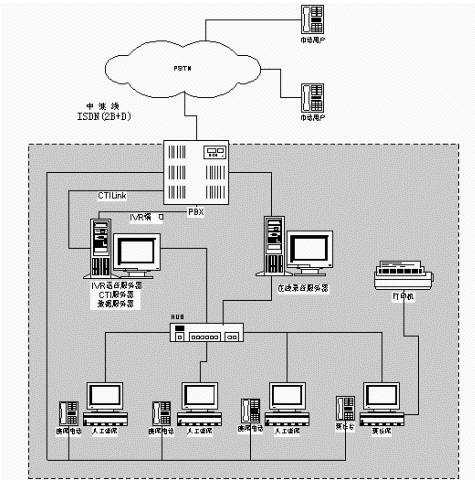 系統(tǒng)目前共設(shè)置了多個人工座席,每人工座席有電腦一臺,耳機(jī)式電話一部。人工座席的電腦與CTI,IVR語音服務(wù)器及數(shù)據(jù)庫服務(wù)器共處一個局域網(wǎng)內(nèi)。