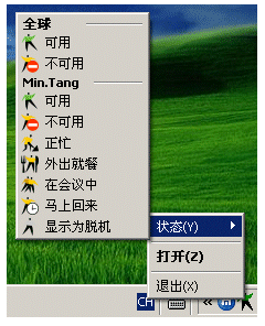 用戶(hù)可以點(diǎn)擊“設(shè)置狀態(tài)”工具欄的上圖標(biāo)或是點(diǎn)擊右下角“系統(tǒng)托盤(pán)”中的圖標(biāo)來(lái)設(shè)置自己的工作狀態(tài)。