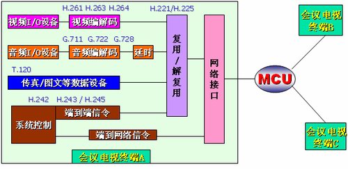如圖所示:視頻會議終端將輸入進(jìn)來的視頻使用H.261、H.263或H.264協(xié)議、音頻使用G.711、G.722或G.728、數(shù)據(jù)、控制信令進(jìn)行單獨編碼,然后將編碼后的數(shù)據(jù)進(jìn)行“復(fù)用”打包后形成遵循網(wǎng)絡(luò)協(xié)議的數(shù)據(jù)包,通過網(wǎng)絡(luò)接口傳到MCU供選擇廣播。從MCU傳來的其他會場的數(shù)據(jù)包通過“解復(fù)用”,分別還原成視頻、音頻以及數(shù)據(jù)及控制信令分別相應(yīng)的輸出設(shè)備上回顯或執(zhí)行。