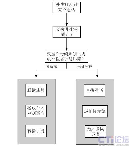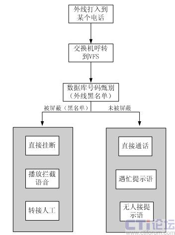 系統(tǒng)利用交換機的話音轉(zhuǎn)移功能,將轉(zhuǎn)移過來的來話信息進行過濾處理,從而實現(xiàn)語音攔截的功能。