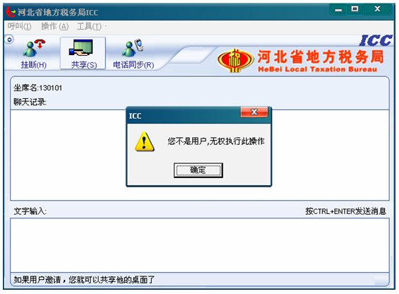 7. 遠程共享:考慮到對納稅人電腦的安全保護,座席端沒有權(quán)利主動共享納稅人的桌面,即坐席不能點擊共享按鈕,如果點擊,將彈出對話框友好提示:“您不是納稅人,無權(quán)執(zhí)行此操作”如下圖: