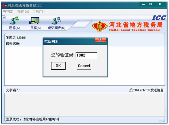 坐席只需通過電話將此框中的驗證碼(比如圖例中的1982驗證碼)告訴和坐席通話的納稅人。然后點擊OK按鈕。納稅人端得到坐席告訴他的驗證碼后,納稅人端也有個電話同步按鈕,納稅人點擊并輸入坐席告訴他的驗證碼后,坐席就可以看到有呼叫進來。此呼叫就是正和坐席通話納稅人的ICC呼叫。坐席點擊應(yīng)答后就可以和此納稅人ICC