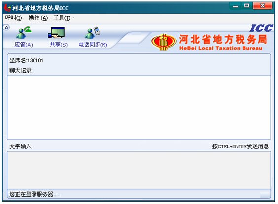 2. 點擊12366界面下面一行按鈕中的ICC按鈕,運行起來ICC。出現(xiàn)ICC界面,此時ICC處于登錄服務(wù)器狀態(tài),左下角的狀態(tài)欄有文字提示“您正在登錄服務(wù)器……”。聊天記錄對話框的上面有坐席名,例如“坐席名:130101”如下圖: