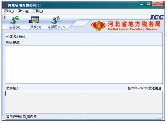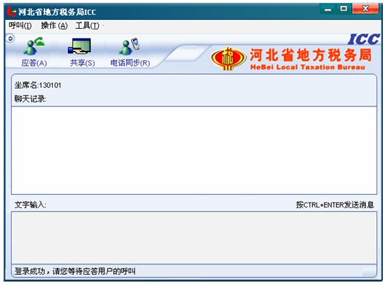 3. 稍等片刻,ICC登錄成功,此時坐席就可以等待納稅人的呼叫了,左下角狀態(tài)欄有文字提示“登錄成功,請等待應(yīng)答用戶的呼叫”。如下圖: