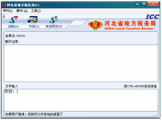 輸入文字信息后按CTRL+ENTER就可發(fā)送消息。輸入的文字可以在 ICC界面上面的聊天記錄對話框中顯示,同時發(fā)送給納稅人。如下圖: