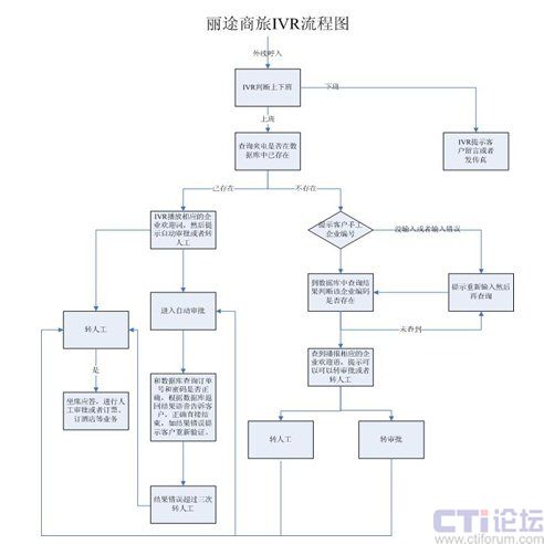 麗途商旅呼叫中心整個呼叫流程是:客戶通過全國400電話呼入系統(tǒng),IVR自動應(yīng)答,根據(jù)客戶來電號碼通過URL的方式和業(yè)務(wù)系統(tǒng)數(shù)據(jù)庫進(jìn)行查詢該來電號碼是否是老客戶,然后直接播報客戶對應(yīng)的企業(yè)名稱和麗途的歡迎語,客戶可以進(jìn)行訂單的審批和密碼驗(yàn)證或者轉(zhuǎn)人工服務(wù);如果是來電號碼在數(shù)據(jù)庫中不存在,IVR系統(tǒng)提示客戶輸入企業(yè)編號或者轉(zhuǎn)接人工服務(wù),輸入企業(yè)編號還會在數(shù)據(jù)庫中查詢是否是已存在客戶并執(zhí)行相應(yīng)的流程,如是新客戶那么就會轉(zhuǎn)接人工服務(wù),由人工來進(jìn)行訂單的制定、審批,密碼驗(yàn)證等工作。