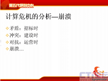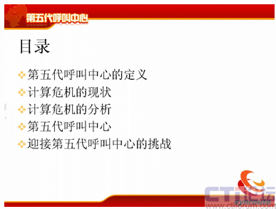 我把第五代呼叫中心的概念詳細(xì)地論述一下。主要是分成五個部分,第一個是第五代呼叫中心的定義;第二個計算危機(jī)的現(xiàn)狀;第三是計算危機(jī)的分析;第四第五代呼叫中心;第五是結(jié)論——迎接第五代呼叫中心的挑戰(zhàn)。