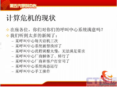 呼叫中心現(xiàn)在已經(jīng)了比較嚴(yán)重的計算危機(jī),我聽到了很多,因為我重點(diǎn)是在搞技術(shù)這一行當(dāng),我就問一個問題,在座的各位,你們對你們的呼叫系統(tǒng)滿意嗎?我相信大部分人可能嘴上都說比較滿意,但是很多人對深層次的矛盾都非常清楚,為什么不滿意?