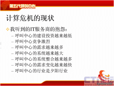 我們聽到IT服務(wù)商的抱怨可就更多了,說呼叫中心建設(shè)投資越來越低了,我在十年前建設(shè)一個20個座席的呼叫中心,能掙1500萬;可是現(xiàn)在20個座席的呼叫中心,10萬塊錢就把我打發(fā)了。呼叫中心競爭越來越激烈,投一個標(biāo),雖然一個呼叫中心只有100萬,這時候來的廠家有50家,相互壓價,相互壓價,這時候利潤都沒有了,F(xiàn)在的需求是越來越多了,體現(xiàn)在各個環(huán)節(jié),運(yùn)營管理和業(yè)務(wù)模式上需求越來越多,最終客戶的要求也是越來越多,系統(tǒng)越來越大了,服務(wù)器也一大堆,以前一兩個服務(wù)器就夠了,現(xiàn)在需要4、5個,7、8個,這些服務(wù)器還需要相互進(jìn)行聯(lián)絡(luò)整合,系統(tǒng)的整合越來越多,比如要和ERP整合,要和CRM整合,要和供應(yīng)鏈整合,系統(tǒng)的整合越來越多,而且需求變化越來越大,呼叫中心需求的變化產(chǎn)生于很多方面,后面我會仔細(xì)介紹。呼叫中心的行業(yè)變成一個夕陽行業(yè)了,這是現(xiàn)在做IT服務(wù)商普遍在提的想法。