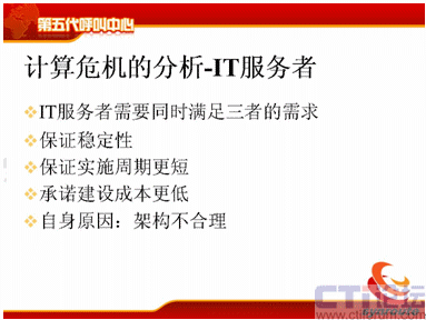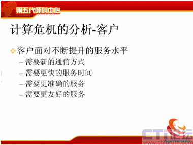 我分析一下計算的危機(jī),計算危機(jī)來源于三個方面,第一是客戶面對不斷提升的服務(wù)水平,現(xiàn)在需要新的通信方式,包括電話、傳真、短信、電子郵件等等,還包括網(wǎng)上的護(hù)航瀏覽,表單共享,電子排版等等通信方式。第二方面需要更快的服務(wù)時間,80%的電話是20秒接起,可是短信的響應(yīng)時間為什么這么長,需要更準(zhǔn)確的服務(wù),電話的服務(wù)是什么樣的,我現(xiàn)在需要網(wǎng)上交談的服務(wù)質(zhì)量也能夠得到保障等等,這是客戶對IT服務(wù)者提供的壓力。