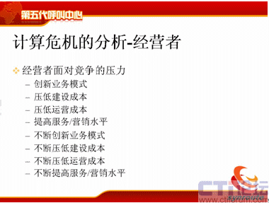 那么經(jīng)營者的壓力就更大了,首先我要創(chuàng)新業(yè)務(wù)模式,我以前是做客戶服務(wù)的,現(xiàn)在我要掙錢,我要增加收入,我要做電話營銷,壓低建設(shè)成本,壓低運(yùn)營成本,這個是大家很容易理解的。同時他是不斷地創(chuàng)新業(yè)務(wù)模式,不斷地壓低建設(shè)成本,不斷地壓低運(yùn)營成本,不斷地提高服務(wù)水平,這個不斷就給IT服務(wù)者傳遞了更大壓力。