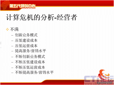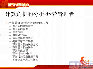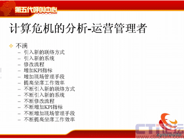 計算危機(jī)的下一方面是運(yùn)營管理者,可能在座很多人是做運(yùn)營管理的,你們會不斷去跟IT服務(wù)者提需求,我下一個月想引進(jìn)新的聯(lián)絡(luò)方式,下個月我想引進(jìn)新的軟件,引進(jìn)新的流程,我想增加KPI指標(biāo),我想增加現(xiàn)場的管理手段,我想提高座席的工作效率,后面也是不斷的,不斷地去引入新的聯(lián)絡(luò)方式。