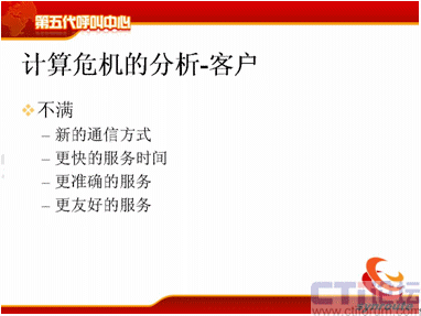現(xiàn)在我們就分析一下后果,這時候計算危機(jī)的分析對于客戶來說,新的通訊方式我們都需要,可是呼叫中心沒有公布,我無法使用,更快的服務(wù)時間,大家看到了,比如說Web Chat,目前我點(diǎn)擊了80%是直接進(jìn)入留言的頁面,也就是說這時候沒有人工來服務(wù)了,或者是等待時間非常非常長,一個小時以后告訴我,排隊已經(jīng)到了,已經(jīng)沒有人能為我服務(wù)的,服務(wù)時間是根本沒有辦法保證的。第三個方面我們要更準(zhǔn)確的服務(wù),電話打進(jìn)去以后告訴我的信息和網(wǎng)絡(luò)告訴我的信息是完全不一樣的呢?為什么呢?因為它的知識庫沒有關(guān)聯(lián)起來,業(yè)務(wù)流程沒有關(guān)聯(lián)起來,這種更友好的服務(wù),考核的指標(biāo)都是一樣的。