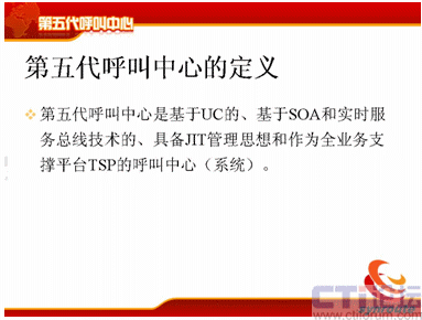 第五代呼叫中心的定義比較簡單,第五代呼叫中心是基于UC的,基于SOA和實時服務(wù)總線技術(shù)的,具備JIT管理思想和作為全業(yè)務(wù)支撐平臺TSP的呼叫中心系統(tǒng)。