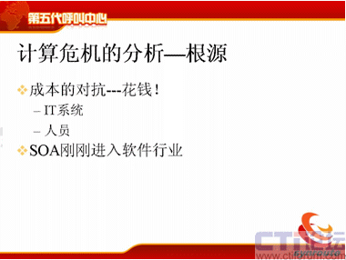 我們分析這個根源,根源其實就是錢的問題,昨天我聽了遠(yuǎn)傳的Bill的講座,講得非常精彩,而且非常幽默,他在整個講的過程中,不斷地提一個次,提了30多次,說是“很花錢”呀,“太花錢”了,“很花錢”。確實是很花錢,呼叫中心是一個燒錢的中心,這是他的理論,其實我的想法也是一樣的。那么對于IT系統(tǒng)來說,確實需要花很多錢,現(xiàn)在的系統(tǒng)大家想想系統(tǒng)要么和CRM對接,要么和ERP對接,有的和供應(yīng)鏈對接,有的和人力資源管理對接,有的和業(yè)務(wù)核心系統(tǒng)對接。那么人員上也是很花錢的,對于外包呼叫中心來說,客戶服務(wù)200座席左右的,人工的成本占到了75%,這個成本是非常高的,確實是很花錢。那么剛才也說了,剛才那些需求,短信的需求,大家看雖然很復(fù)雜,如果給我一千萬的話,我能輕松地把它搞定,給我一年的時間,但這是不現(xiàn)實的。解決的辦法有嗎?有,SOA。SOA是現(xiàn)在軟件行業(yè)一直在做的一件事情,是公認(rèn)的標(biāo)準(zhǔn),但是它剛剛進(jìn)入中國,而且還都沒有進(jìn)入呼叫中心。