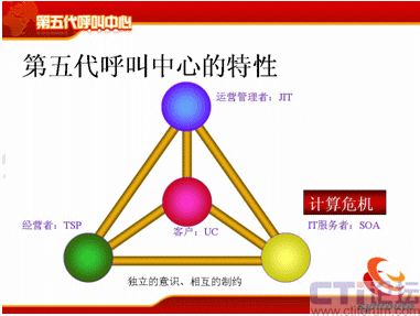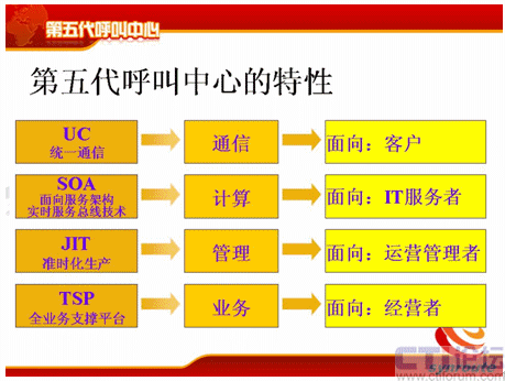 從分代上來講,和何總說的稍微有點(diǎn)差異,但是基本上一樣的,第一代是人工熱線的電話系統(tǒng),時間點(diǎn)也差不多;第二代是有了座席IVR、自動語音應(yīng)答這個特點(diǎn);第三代是有了CTI、ACD企業(yè)級的呼叫中心;第四代是互聯(lián)網(wǎng),有VOIP、多媒體等等這些多媒體的呼叫中心。那么第五代是什么?第五代的典型特征是融合共享,它是有四個特性,UC、SOA、JIT和TSP,這是五代的幾個主要特點(diǎn)。