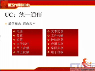 那么這幾個特點(diǎn)稍微簡單地說一下,可能大家了解比較多了,從UC上來講,不管是現(xiàn)在國際上比較領(lǐng)先的通信廠商,CISCO、華為都在提UC的概念,軟件行業(yè)包括微軟。UC包括了通信的渠道,包括電話、傳真、短信、電子郵件、網(wǎng)上音頻、視頻,文本交談,文件傳輸、護(hù)航瀏覽、應(yīng)用共享、桌面共享等等,這是統(tǒng)一通信的部分。