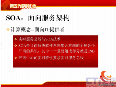 SOA就是面向服務(wù)的架構(gòu),這個概念近兩、三年來在中國的發(fā)展是比較快的,計算的概念,它是面向IT提供者。實時服務(wù)總線技術(shù)與SOA,SOA是目前解決軟件系統(tǒng)聚合難題的全球各個廠商的共識,其中一個重要的概念是ESB,不知道大家清楚嗎?就是企業(yè)服務(wù)總線,是SOA里面重要的組成部分,呼叫中心的實時特性要求,這個服務(wù)總線不是普通的服務(wù)總線,而是實時的服務(wù)總線。