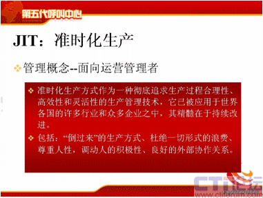 這四個特性是相輔相成的,首先在獨(dú)立方面,每一部分都有自己的特點(diǎn),適應(yīng)自己企業(yè)發(fā)展的需要,同時也是相互制約的。首先我說這個獨(dú)立意識,對于呼叫中心來說,從經(jīng)營者的角度上,為什么要提TSP的概念呢?我們經(jīng)常遇到一個企業(yè)建立呼叫中心,是一個客戶服務(wù)中心,我們現(xiàn)在要做電話營銷了,那好吧,我們就建一套電話營銷系統(tǒng);這時候我們要做網(wǎng)絡(luò)方面的營銷,好了,我們再做一個網(wǎng)絡(luò)營銷的呼叫中心,這是經(jīng)營者現(xiàn)在意識亟待需要提高的。對于運(yùn)營管理者來說,JIT思想,我剛才說過它是一個核心的,它是一個不斷需要改進(jìn)流程的,改進(jìn)去優(yōu)化的,提出各種KPI指標(biāo)去優(yōu)化的,那么這個過程也是現(xiàn)在目前運(yùn)營管理者一直比較薄弱的,需要一直提高的部分。
