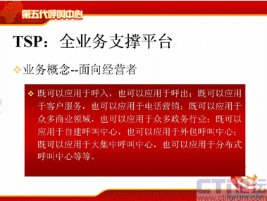 TSP這個概念其實比較清晰,比較簡單,它的意思就說對于呼叫中心來說,它能支持各種業(yè)務(wù),既可以支持呼入,也可以支持呼出;既可以應(yīng)用于客戶服務(wù),也可以應(yīng)用于電話營銷;既可以應(yīng)用于商業(yè)領(lǐng)域,也可以應(yīng)用于政務(wù)領(lǐng)域;既可以用于自建,也可以用于外包;可以是大規(guī)模集中的,也可以是分布式的。